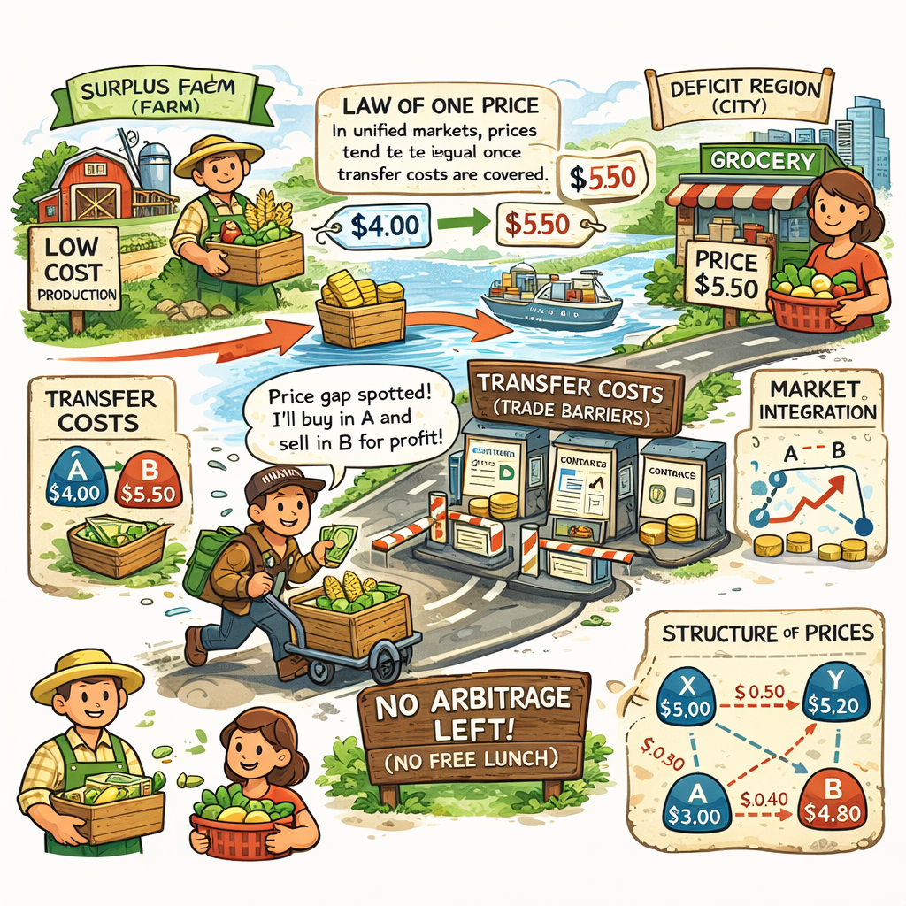class: center, middle, inverse, title-slide .title[ # Agricultural Markets ] .subtitle[ ## Lecture 6: Market Integration and Trade ] .author[ ### David Ubilava ] .date[ ### University of Sydney ] --- # Linkage across spatially separated markets .pull-left[  ] .pull-right[ - Agricultural commodities typically are produced in geographically diverse locations, and can be costly to transport. - Relationships among geographically distant, i.e., spatially separated, markets involve market equilibria across individual locations, but are often examined by just comparing prices in these markets. ] --- # Transfer costs .right-column[ - To the extent that supply and demand forces differ across markets, prices of agricultural commodities can (and do) vary spatially. - Given a competitive market structure, spatial price relationships are determined by *transfer costs* among markets. - While transportation is one of the key determinants of the transfer costs, its other important components may include costs related to contracting, insurance, financing, etc. ] --- # Competitive equilibrium .right-column[ - Spatial arbitrage, through the actions of economic agents, ensures that the price differential between regions `\(i\)` and `\(j\)`, `\(p_{jt}-p_{it}\)` at any given time, `\(t\)`, does not exceed the transfer costs, `\(\tau_{ijt}\)`: `$$p_{jt}-p_{it} \le \tau_{ijt}.$$` This is referred to as *long-run competitive equilibrium*. - The condition will hold as an equality if the two regions trade, thereby exhausting the rents to spatial arbitrage. - When trade occurs, price differentials should move one-for-one with the costs of spatial arbitrage or there may be no correlation among market prices even if the competitive equilibrium holds. ] --- # Market integration .right-column[ - *Market integration*, defined as tradability or contestability between markets, is a (related but) slightly different concept from competitive equilibrium. - Market integration implies the transfer of excess demand from one market to another, manifest in the physical flow of commodity, the transmission of price shocks from one market to another, or both. ] --- # Spatial equilibrium model .right-column[ <img src="06-Spatial_files/figure-html/trade-1.png" width="100%" style="display: block; margin: auto;" /> ] --- # The Law of One Price .right-column[ - Two spatially separated markets: * can be *in equilibrium* but not necessarily *integrated* (e.g., when the spatial arbitrage condition is satisfied but no trade occurs); * can be *integrated* but not necessarily *in equilibrium* (e.g., when trade occurs but the spatial arbitrage is not exhausted). - When both conditions are met, the *law of one price* (LOP) holds. ] --- # The Law of One Price .right-column[ - The LOP suggests that, abstracting from transfer costs, spatially separated markets that are linked by trade and arbitrage, will have a common, or unique price. - While the LOP (in its strong form) rarely holds in practice, there is evidence for LOP in empirical literature that explicitly accounts for transactions costs, or that explicitly focuses on traded rather than non-traded commodities. ] --- # Efficient markets .right-column[ - Key to the LOP is the notion of *efficient markets*. - Efficiency is meant to imply that the allocation of resources is such that aggregate welfare cannot be further improved by reallocating of resources. - In the context of spatial arbitrage, market efficiency implies that no opportunities for profits have been left unexploited by arbitrageurs. That is, the efficient market hypothesis assumes away profitable arbitrage opportunities. ] --- # Some issues with measuring market integration .right-column[ - Several caveats are in order: * price co-movement between two regions can arise for reasons other than those that link these regions via trade; * prices that satisfy the LOP may not move together, if transfer costs are large and volatile; * it is not necessary for two regions to be direct trading partners for an integration to be present. As long as these regions are part of a common trading network, they may be integrated just as strongly as if they were direct trading partners. ] --- # Some issues with measuring market integration .right-column[ - Several important implications follow: * because trade will only occur when the price differential equals or exceeds the transfer cost, shocks to production or consumption may result in discontinuous trade flows over time; * to the extent that trade takes place, the price differential will remain the same (and be equal to the transfer cost); * integrated markets will be characterized by the simultaneous determination of prices, trade, and storage. ] --- # The structure of prices .pull-left[ <img src="06-Spatial_files/figure-html/structure-1.png" width="100%" style="display: block; margin: auto;" /> ] .pull-right[ - The LOP may not apply if buyers have less than perfect information about where to find the lowest price commodity; nor may they apply across international borders, because some goods are not transferable. - These principles facilitate the so-called *structure of prices* - a function of the pattern of trade and transfer costs between the trading regions. ] --- # Some implications of the structure of prices .right-column[ - Implications of the structure of prices are that: * the lowest-cost source determines the price in each deficit market; * producers sell in a market that yields the highest net return; * the price prevailing in each surplus producing area is the deficit market price less the cost of transferring a product to that market. - This assumes a competitive market structure, with a homogeneous commodity, informed traders, and no barriers to trade. ] --- # Why countries trade .right-column[ - There is, by and large, a consensus (among the economists) on that trade is, usually, helpful for successful economics development. - There is also a consensus on that trade generates both ga