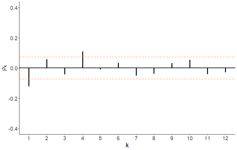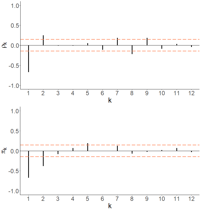 class: center, middle, inverse, title-slide .title[ # Forecasting for Economics and Business ] .subtitle[ ## Lecture 6: Moving Average ] .author[ ### David Ubilava ] .date[ ### University of Sydney ] --- # Wold Decomposition .pull-left[  ] .pull-right[ It is possible to decompose any covariance stationary autoregression into a weighted sum of its error terms (plus a constant). For example, using recursive substitution we can represent an `\(AR(1)\)` process as: `$$y_t = \alpha + \beta y_{t-1} + \varepsilon_t = \frac{\alpha}{1-\beta} + \sum_{i=0}^{\infty}\beta^i\varepsilon_{t-i}$$` This is known as the *Wold decomposition*. ] --- # Wold Decomposition .right-column[ Specifically, the *Wold Decomposition Theorem* states that if `\(\{Y_t\}\)` is a covariance stationary process, and `\(\{\varepsilon_t\}\)` is a white noise process, then there exists a unique linear representation as: `$$Y_t = \mu + \sum_{i=0}^{\infty}\theta_i\varepsilon_{t-i}$$` where `\(\mu\)` is the deterministic component, and the rest is the stochastic component with `\(\theta_0=1\)`, and `\(\sum_{i=0}^{\infty}\theta_i^2 < \infty\)`. This is an infinite-order moving average process, denoted by `\(MA(\infty)\)`. ] --- # First-order moving average .right-column[ What does a time series of a moving average process looks like? To develop an intuition, let's begin with a `\(MA(1)\)`: `$$y_t = \mu + \varepsilon_t + \theta\varepsilon_{t-1},\;~~\varepsilon_t\sim iid~\text{N}\left(0,\sigma^2_{\varepsilon}\right)$$` Suppose `\(\mu = 5\)`, and `\(\sigma_{\varepsilon}=0.5\)`, and let's simulate time series by setting `\(\theta\)` to `\(0.5\)`, `\(-1\)`, and `\(2\)`, respectively. ] --- # First-order moving average .pull-left[ <!-- --> ] .pull-right[ <!-- --> ] --- # First-order moving average .pull-left[ <!-- --> ] .pull-right[ <!-- --> ] --- # First-order moving average .pull-left[ <!-- --> ] .pull-right[ <!-- --> ] --- # First-order moving average .right-column[ Several features of interest are apparent: - only one spike at the first lag (i.e., only `\(\rho_1 \neq 0\)`), the remaining autocorrelations are zero; - the size of the spike is directly proportional to the size of `\(\theta\)`, for `\(|\theta| < 1\)`; - the sign of the spike is the same as that of `\(\theta\)`. ] --- # First-order moving average .right-column[ The unconditional mean of the series is equal to its deterministic component, `\(\mu\)`. That is: `$$E(y_t) = E(\mu + \varepsilon_t + \theta\varepsilon_{t-1}) = \mu$$` The unconditional variance is proportional to `\(\theta\)`. `$$Var(y_t) = E(y_t - \mu)^2 = E(\varepsilon_t + \theta\varepsilon_{t-1})^2 = (1+\theta^2)\sigma^2_{\varepsilon}$$` <!-- - From the above, the mean and variance of the process are time-invariant. --> ] --- # First-order moving average .right-column[ The first-order autocovariance: `$$\gamma_1 = E\left[(y_t - \mu)(y_{t-1} - \mu)\right] = E\left[(\varepsilon_t + \theta\varepsilon_{t-1})(\varepsilon_{t-1} + \theta\varepsilon_{t-2})\right] = \theta\sigma^2_{\varepsilon}$$` The first-order autocorrelation: `$$\rho_1 = \frac{\gamma_1}{\gamma_0} = \frac{\theta}{1+\theta^2}$$` The time-invariant autocovariance, in conjunction with time-invariant mean and variance measures, suggest that MA(1) is a covariance stationary process. ] --- # First-order moving average .right-column[ Note that the two cases, `\(\theta=0.5\)` and `\(\theta=2\)` produce identical autocorrelation functions (and that `\(\theta=0.5\)` is the inverse of `\(\theta=2\)`). This can be generalized to any `\(\theta\)` and `\(1/\theta\)`. That is, two different MA processes can produce the same autocorrelation. But only that with the moving average parameter less than unity is *invertible*. Invertability of a moving average process is a useful feature as it allows us to represent the unobserved error term as a function of past observations of the series. ] --- # Second-order moving average .right-column[ The foregoing analysis of a MA(1) process can be generalized to any MA(q) process. Let's focus on MA(2), for examle: `$$y_t = \mu + \varepsilon_t+\theta_1\varepsilon_{t-1}+\theta_2\varepsilon_{t-2}$$` Suppose, as before, `\(\mu = 5\)`, and `\(\sigma_{\varepsilon}=0.5\)`, and let's simulate time series by setting `\(\{\theta_1,\theta_2\}\)` to `\(\{0.5,0.5\}\)`, `\(\{-1,0.5\}\)`, and `\(\{2,-0.5\}\)`, respectively. ] --- # Second-order moving average .pull-left[ <!-- --> ] .pull-right[ <!-- --> ] --- # Second-order moving average .pull-left[ <!-- --> ] .pull-right[ <!-- --> ] --- # Second-order moving average .pull-left[ <!-- --> ] .pull-right[ <!-- --> ] --- # Second-order moving average .right-column[ The unconditional mean and variance are: `$$E(y_t) = E(\mu + \varepsilon_t+\theta_1\varepsilon_{t-1}+\theta_2\varepsilon_{t-2}) = \mu$$` and `$$Var(y_t) = E(y_t-\mu)^2 = (1+\theta_1^2+\theta_2^2)\sigma_{\varepsilon}^2$$` ] --- # Second-order moving average .right-column[ The autocovariance at the first lag is: `$$\gamma_1 = E[(y_t-\mu)(y_{t-1}-\mu)] = (\theta_1+\theta_1\theta_2)\sigma_{\varepsilon}^2$$` and the corresponding autocorrelation is: `$$\rho_1 = \frac{\gamma_1}{\gamma_0} = \frac{\theta_1+\theta_1\theta_2}{1+\theta_1^2+\theta_2^2}$$` ] --- # Second-order moving average .right-column[ The autocovariance at the second lag is: `$$\gamma_2 = E[(y_t-\mu)(y_{t-2}-\mu)] = \theta_2\sigma_{\varepsilon}^2$$` and the corresponding autocorrelation is: `$$\rho_2 = \frac{\gamma_2}{\gamma_0} = \frac{\theta_2}{1+\theta_1^2+\theta_2^2}$$` The autocovariance and autocorrelation at higher lags are zero. In general, for any `\(MA(q)\)`, `\(\rho_k=0,\;\;\forall\; k>q\)`. ] --- # Bitcoin prices (avg. across major exchanges) .right-column[ <!-- --> ] --- # ACF of Bitcoin daily returns .pull-left[ Autocorrelations at lags one and four appear statistically significant. ] .pull-right[ <!-- --> ] --- # PACF of Bitcoin daily returns .pull-left[ Partial autocorrelations, also, statistically significant at lags 1 and 4. ] .pull-right[ <!-- --> ] --- # Order 