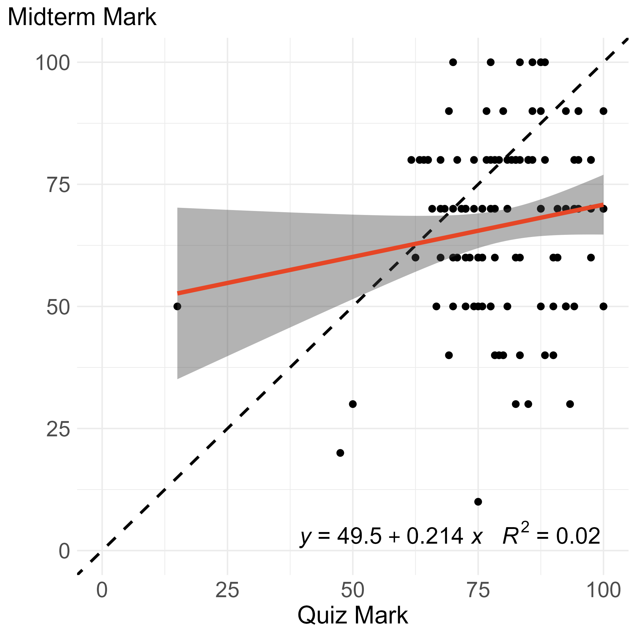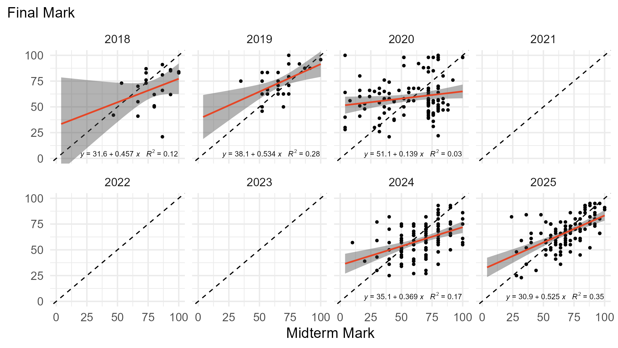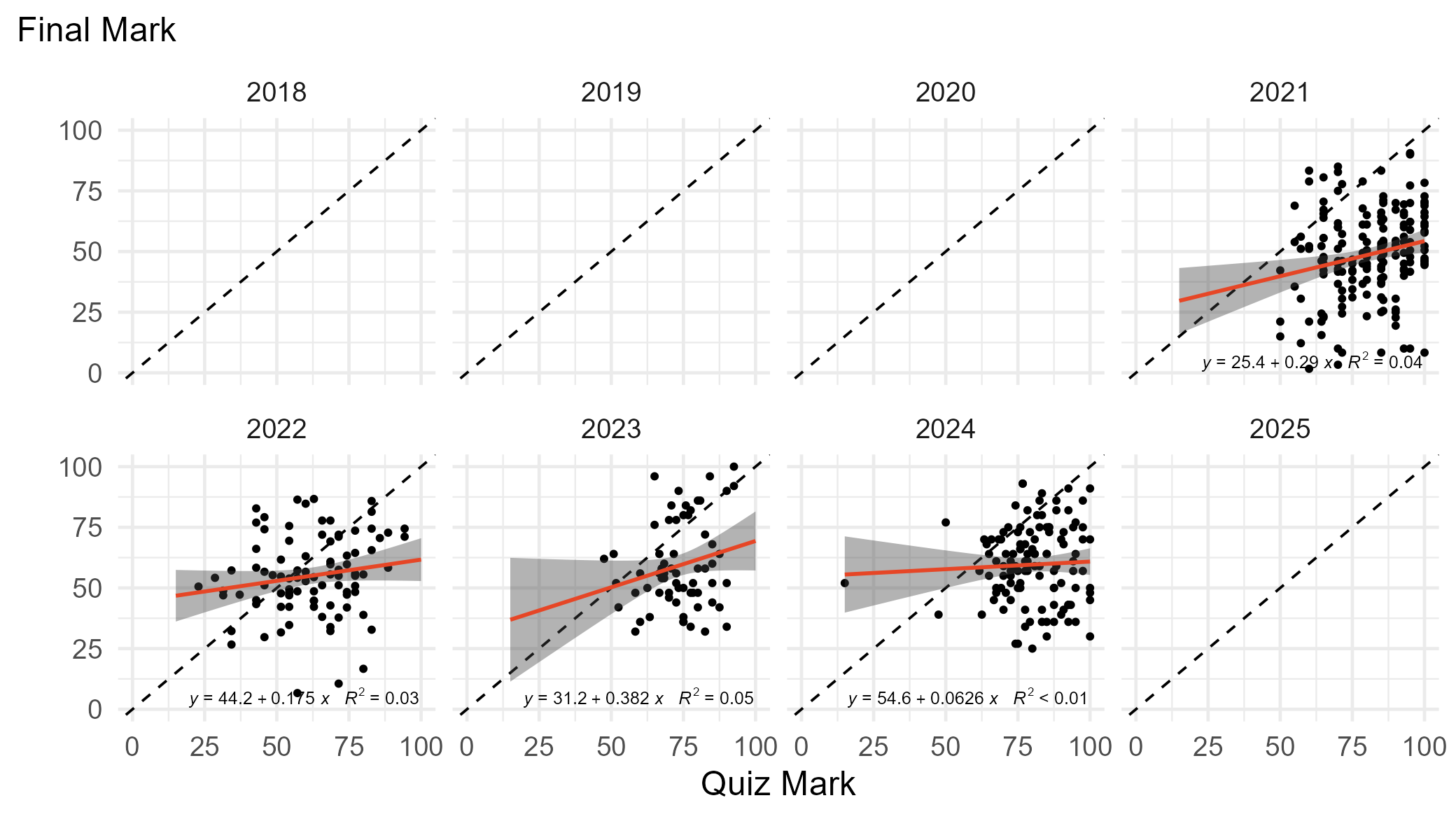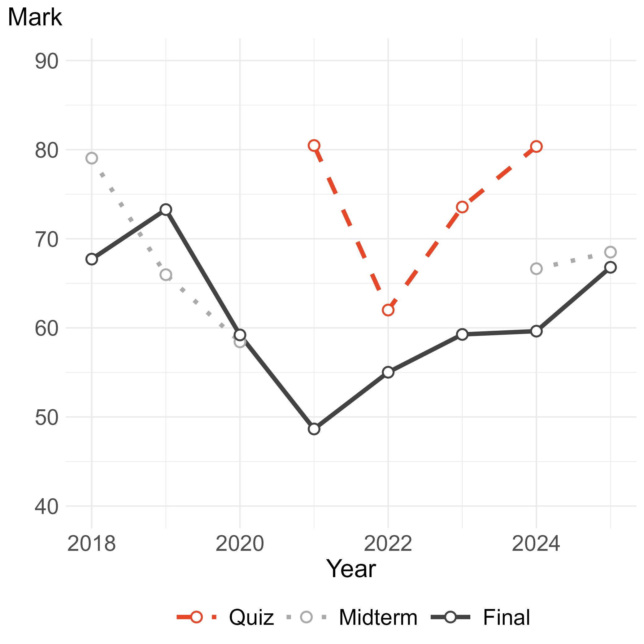 class: center, middle, inverse, title-slide .title[ # Closed-Book vs Open-Web ] .subtitle[ ## Presented at the FASS Teaching Symposium 2025 ] .author[ ### David Ubilava ] --- # Why are we having this conversation .right-85[ Open-book exams have been around for quite some time. Even open-web exams and assessments are older than most of us would care to admit. But until recently, they were not a big deal. Certainly not as big of a deal as they are now. The reason? Technology. Which, as is often the case, can be both a friend and a foe. ] --- # Some context and relevant details .right-85[ The following graphs and observations are based on a large(-ish) unit that I have been teaching for over a decade. The unit is somewhat math-heavy, but not excessively so. ] --- # Dip and recovery in exam performance .left-45[ (Closed-book) final exam marks dipped at the onset of the pandemic - following the switch to online teaching - and gradually recovered in subsequent years. (Open-web) quiz marks were consistently and substantially higher than the final exam marks. ] .right-45[  ] --- # Midterm marks more or less "explain" final marks .right-85[  ] --- # Quiz marks are all but unrelated to final marks .right-85[  ] --- # Hardly any relationship between online and in-class tests .left-45[ In 2024, I ran both closed-book midterm tests and online quizzes. For the midterm, I ran three different in-class tests. The midterm mark was based on the best of the three results. Even so, the average midterm mark was well below the average quiz mark, and quiz performance had virtually no predictive power for the midterm. ] .right-45[  ] --- # How students score the unit .left-45[ Student satisfaction - across all dimensions - dipped at the onset of the pandemic, following the switch to online teaching. Satisfaction with overall quality and feedback recovered quickly, whereas satisfaction with assessment quality remained subdued for as long as (open-web) quizzes constituted a substantial component of assessment. ] .right-45[  ] --- # What students say about the unit .left-45[ During the period of pandemic-related online teaching and assessment, there was a **small decline** in the positive sentiment in students’ responses to the open-ended question, “*What have been the best aspects of this unit of study?*”, and a **substantial increase** in the negative sentiment in their responses to the question, “*What aspects of this unit of study most need improvement?*” ] .right-45[  ] --- # In conclusion... .right-85[ ... and to paraphrase Winston Churchill: *closed-book exams are the worst form of assessments except for all those other forms that have been tried from time to time.* ]